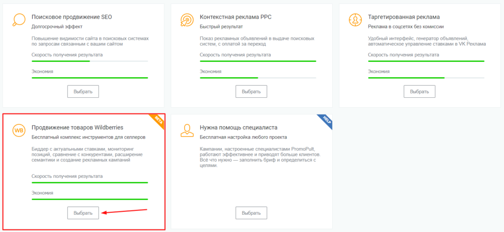 Чтобы воспользоваться инструментом, зарегистрируйтесь или авторизуйтесь в PromoPult, выберите «Продвижение товаров Wildberries»: