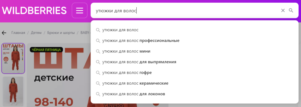 3. Поисковые подсказки Wildberries. Введя запрос в строку поиска, можно посмотреть поисковые подсказки. Так можно выявить конкретные предпочтения аудитории. В примере ниже видно, что в категории «утюжки для волос» пользователи ищут профессиональные утюжки, утюжки для волос гофре, керамические утюжки и так далее.