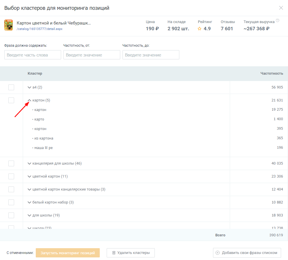 После выбора товара инструмент автоматически подберет для него кластеры ключевых слов, по которым будет отслеживать позиции. Кластеры можно отфильтровать по частотности, а также раскрыть, чтобы посмотреть, какие запросы в них входят:
