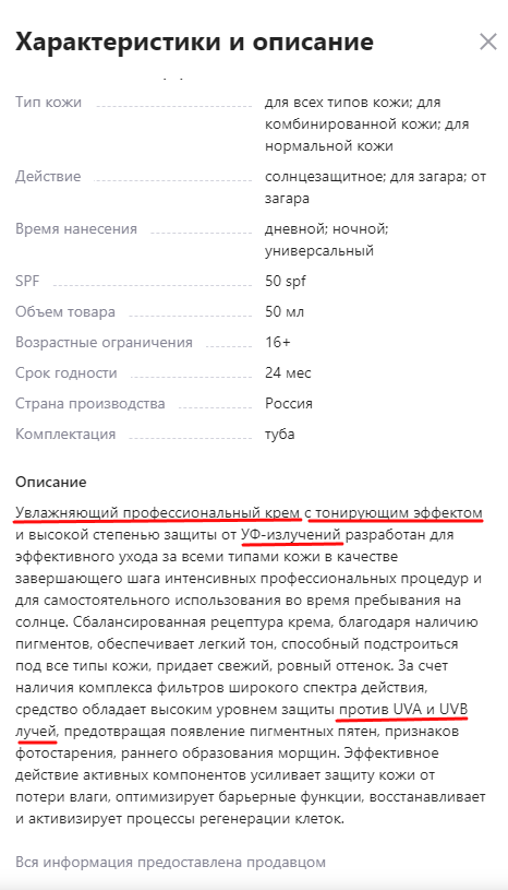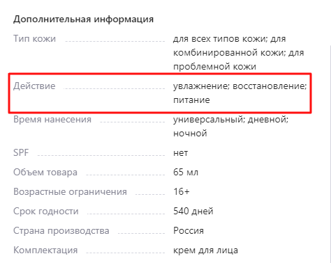 Заполните графу «Действие». Например, это подходит для таких товаров, как уходовая косметика. В разделе «Действие» пишем, что крем увлажняет, восстанавливает и питает кожу.