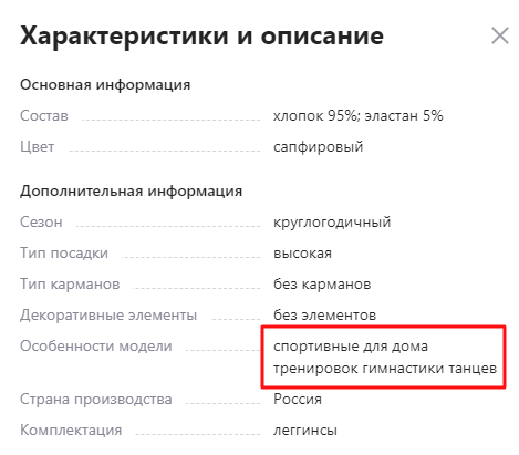 Для одежды укажите особенности модели. Это упростит поиск пользователям по каталогу и позволит добавить ваш товар в дополнительную категорию. Например, для леггинсов можно указать, что они подходят для дома, спорта, тренировок, гимнастики и танцев.