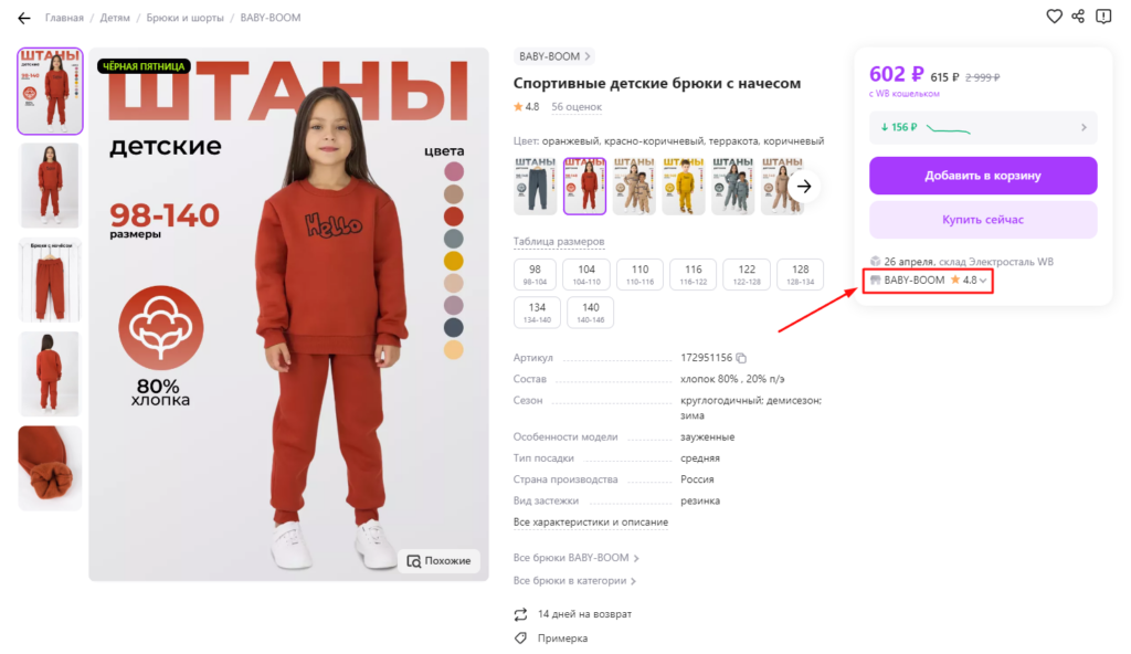 В карточке товара показывается рейтинг и отзывы покупателей. Чем выше рейтинг и больше отзывов — тем лучше для продвижения карточки.