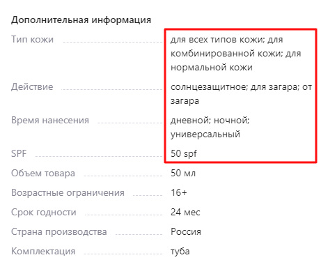Для того чтобы товар попал сразу в несколько категорий, нужно максимально подробно заполнить карточку и проработать раздел «Дополнительная информация». Здесь могут быть такие поля: назначение подарка, действие, тип кожи (для косметического средства).