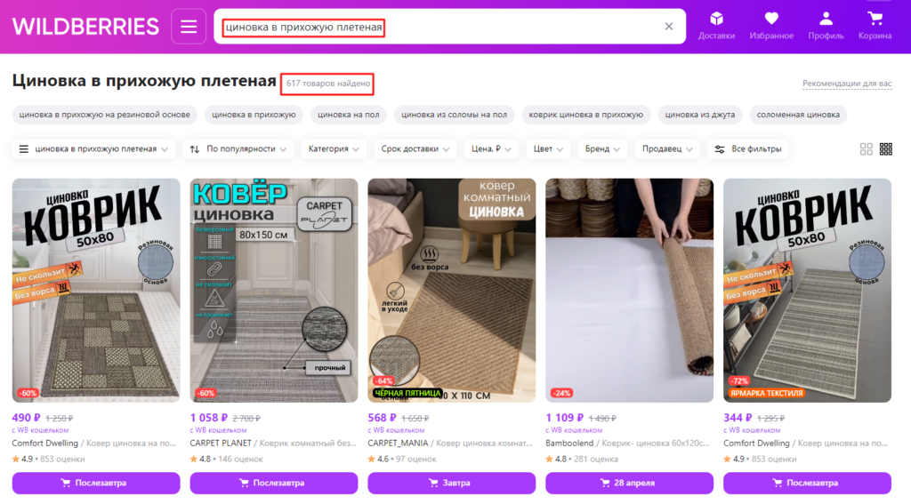 4. Анализ результатов поисковой выдачи вручную. Бесплатный, но трудоемкий способ — вбивать по очереди названия товаров в строку поиска Wildberries и оценивать количество предложений. Это поможет определить уровень конкуренции в нише и конкретной товарной категории. Например, по запросу «циновка в прихожую плетеная» в выдаче показывается 617 товаров. Значит эта категория не высококонкурентная и в нее можно заходить.