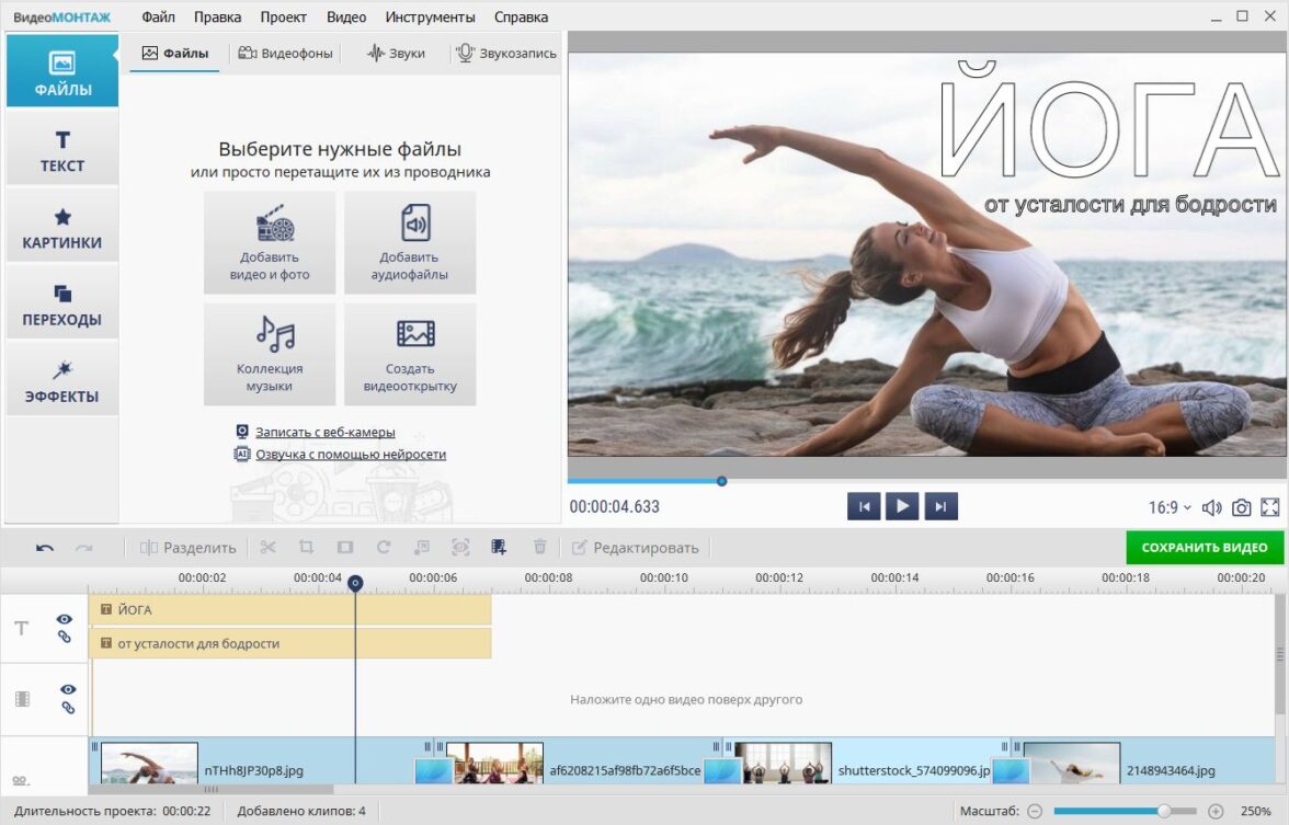 ВидеоМОНТАЖ — простая в использовании программа для монтажа видео, идеально подходящая для начинающих. Здесь можно добавить плавные переходы, улучшить цветопередачу и стабилизировать изображение. Встроенная библиотека включает футажи, заставки и шрифты, которые помогают быстро создавать видеоролики. Например, в рекламном клипе можно всего за несколько минут наложить фоновую музыку, применить кинематографические фильтры и заменить фон с помощью хромакея, переместив героя в нужный пейзаж.