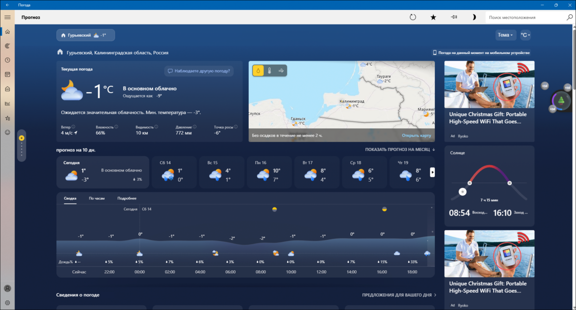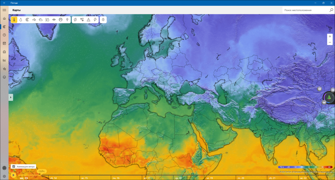 Скриншот из приложения Погода Windows 11. Режимы «Карта» и «Температура»