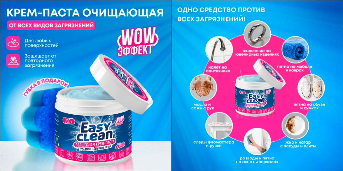 Инфографика из карточки средства для уборки дома в OZON. Продавец выделил название товара и его назначение. Упомянул бесплатный бонус и конкретизировал, с какими видами загрязнений справляется средство