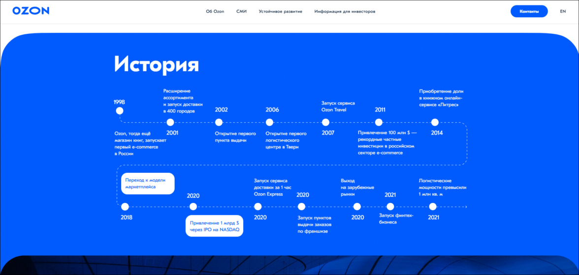 Материал с корпоративного сайта OZON. История компании отображается в виде своеобразной дорожки. Посетитель ресурса начинает путешествие по ней с точки вверху слева (дата основания). Затем последовательно перемещается вправо по значимым событиям. Доходит до конца «строки» и опять оказывается в крайней левой позиции, но чуть ниже