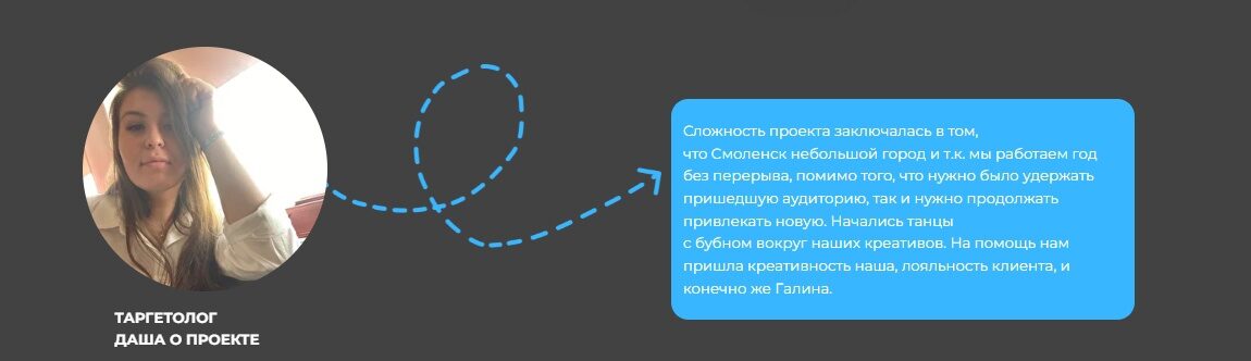 Рекламная кампания шла великолепно. В какой-то момент мы поняли, что акцент нужно сделать на Галине (наша Смоленская Ариель (продавец магазина)). Мы создавали видео, розыгрыши, рилс, интеграции с компаниями Смоленска. Каждый креатив дарил радость не только нам и заказчику, но и жителям Смоленска. Медленно, но верно строили бренд вокруг Галины.