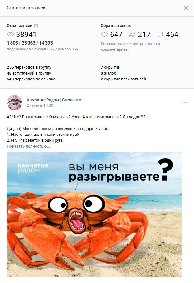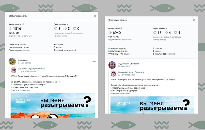 — Через день мы запостились в двух пабликах Смоленска (выхлоп плохой, делать так больше не будем). Вот статистика посевов: