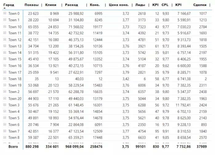 пример отчета, где можно посмотреть рентабельность рекламы по срезам: например, по каждому городу