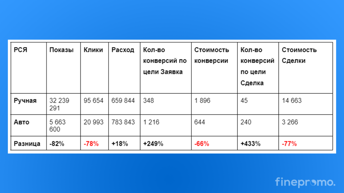 На ручном управлении кампании давали результат хуже допустимого KPI. Когда перевели их на автостратегию, то достигли и даже превзошли KPI.