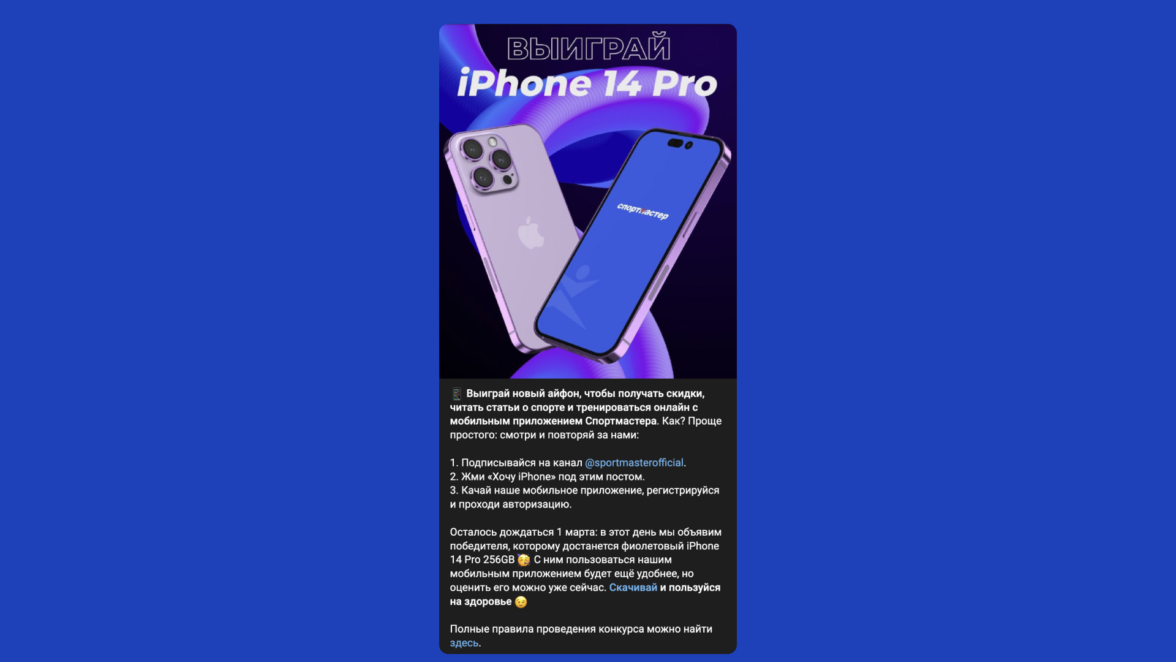 крупной конкурсной активации в Telegram с розыгрышем айфона;