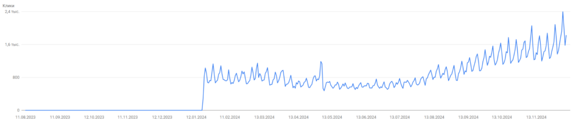 На графике показан рост трафика для одной подборки сразу после внедрения решения. Страницы материалов с микроразметкой попали в блок рецептов Google. Суммарно за 11 месяцев 2024 года сайт получил около 68 тысяч кликов по ним