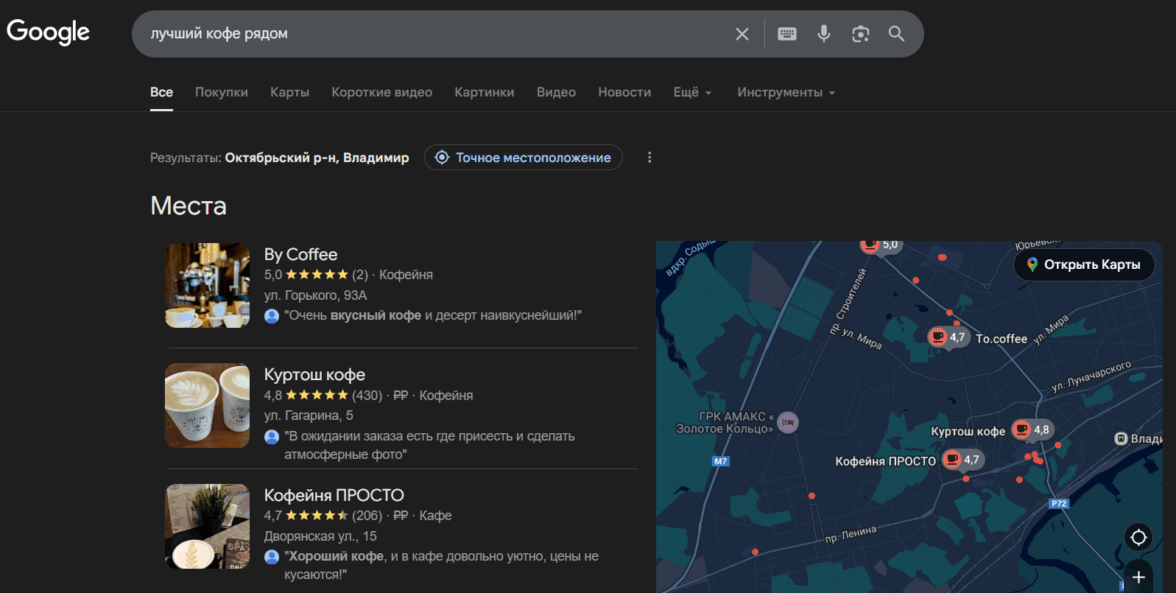 Выдача Google по запросу «лучший кофе рядом»