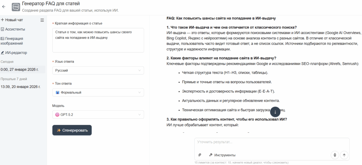 Создать блок FAQ легко и быстро можно с помощью ИИ-генератора. Вам нужно только вести краткую информацию о статье или тексте, выбрать тон ответа и модель нейросети.
