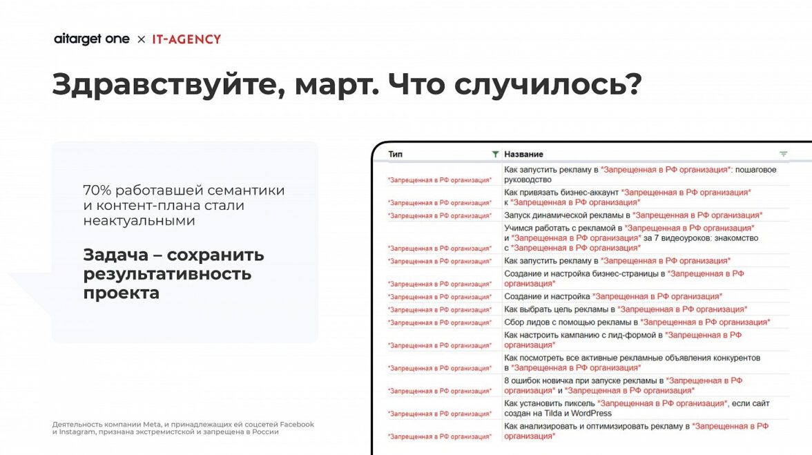 В марте 2022 года 70% работавшей ранее семантики стали неактуальными. Спрос на информацию о рекламных площадках, которые составляли структуру контент-плана, кардинально изменился.