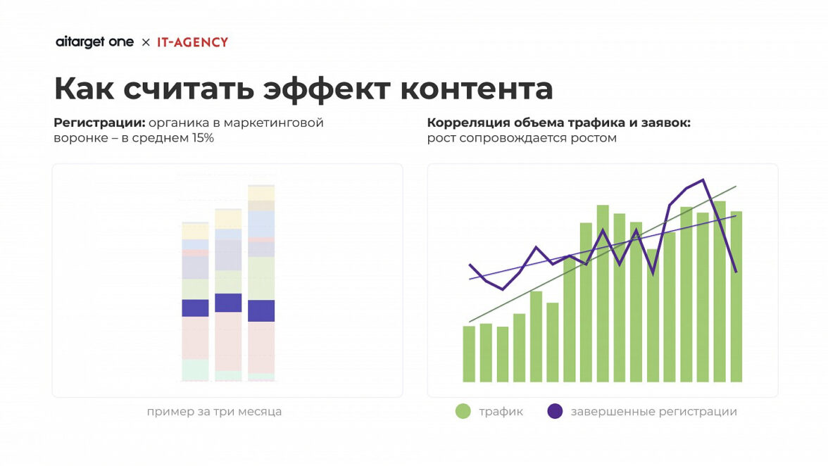 Левый график показывает участок воронки с разбивкой по разным каналам привлечения. Он подтверждает, что блог (выделен фиолетовым) — полноценный участник лидогенерации. Правый график показывает тренд: растёт трафик — растёт количество регистраций в сервисе