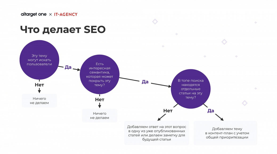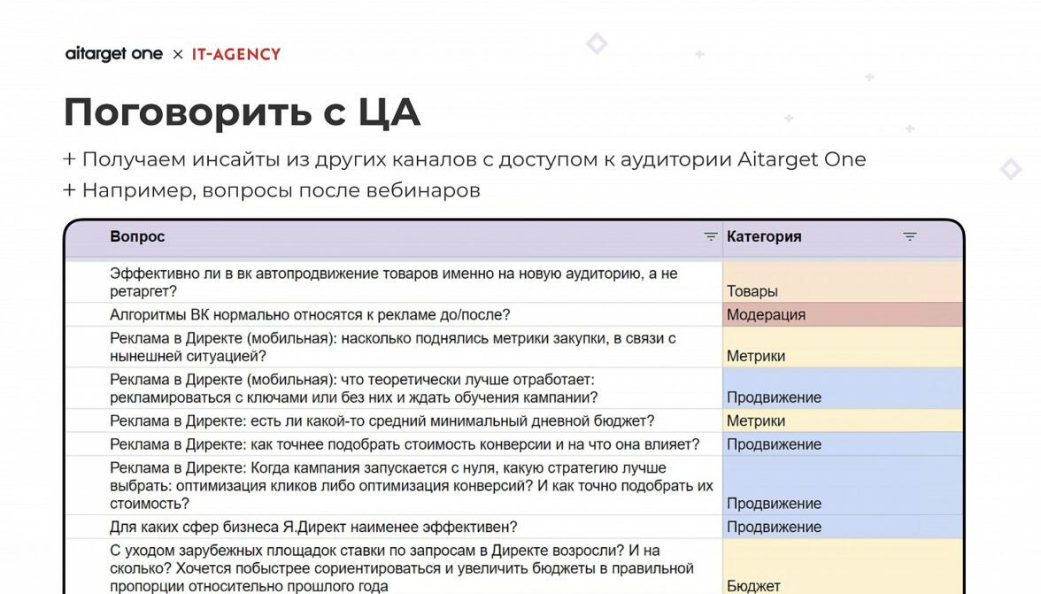 Примеры вопросов, которые задаёт потенциальная ЦА Aitarget One во время вебинаровАлгоритм, по которому мы определяем, включать ли новую тему в контент-план