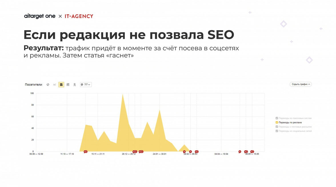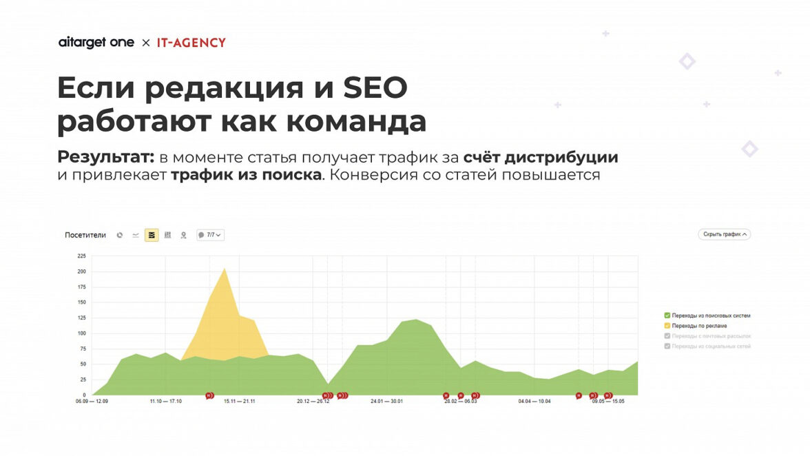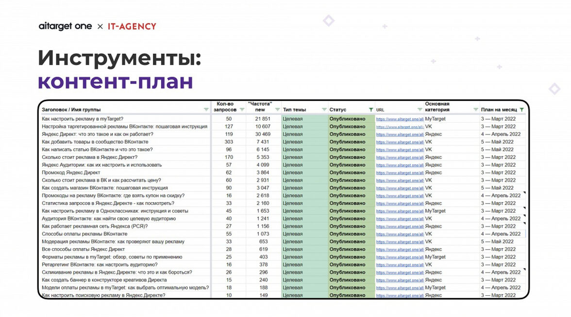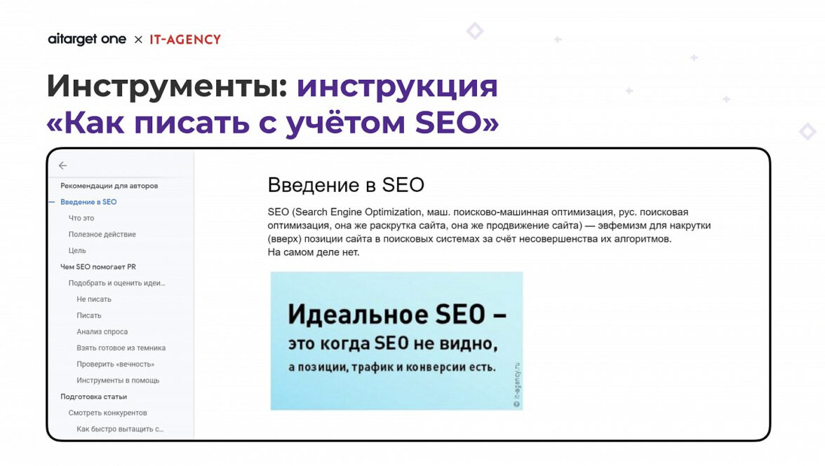 В итоге подготовку материалов полностью передали редакции Aitarget One. Чтобы SEO-рекомендации соблюдались, оптимизаторы IT-Agency подготовили инструкцию и провели вебинар для команды авторов.