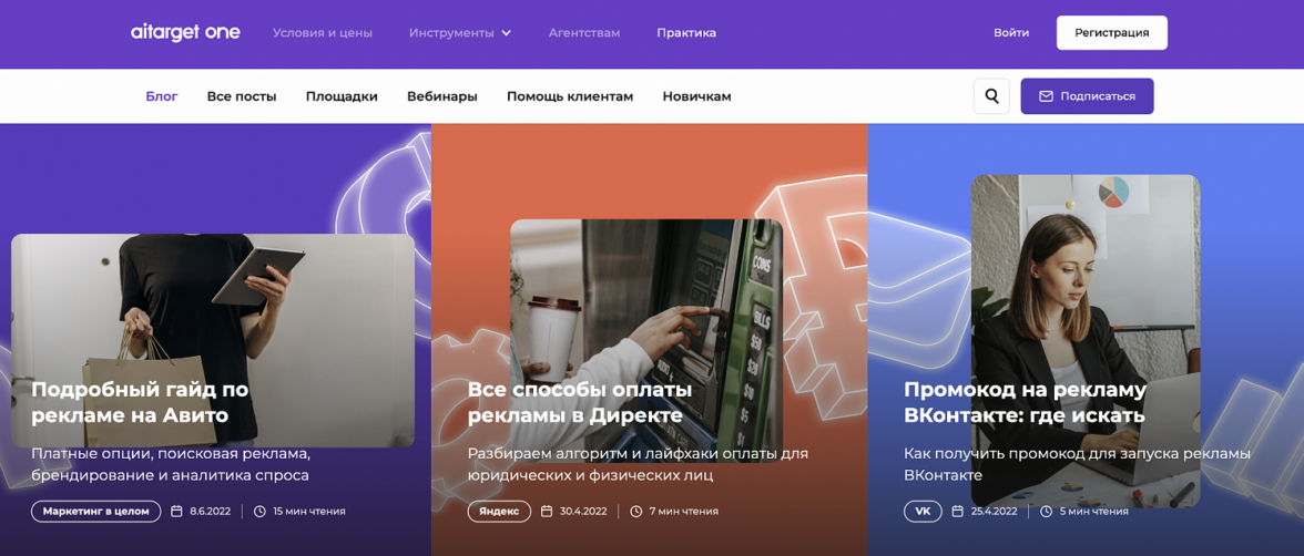Так выглядит блог Aitarget One. Статьи блога отвечают на вопросы аудитории о рекламе