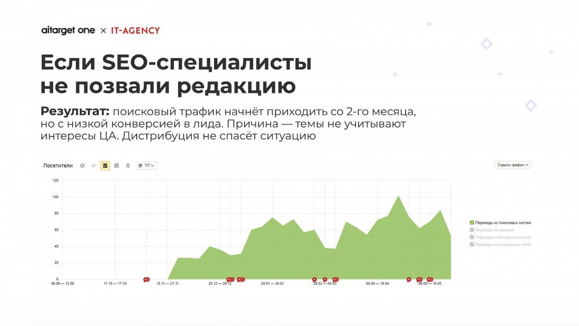 Одной из основных задач маркетинга Aitarget One стало сохранить SEO в качестве канала привлечения трафика. Он работал стабильно, тогда как часть рекламных каналов для компании стали недоступны.