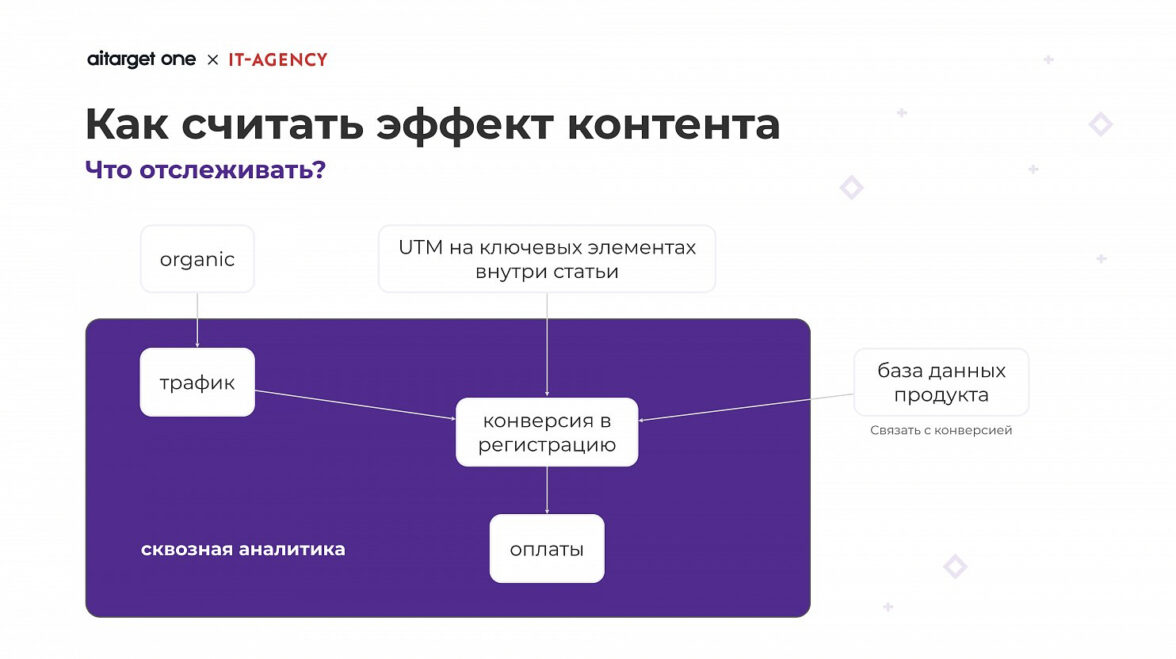 Сквозная аналитика помогает посмотреть вклад двух каналов. Она объединяет данные с сайта и базу данных продукта