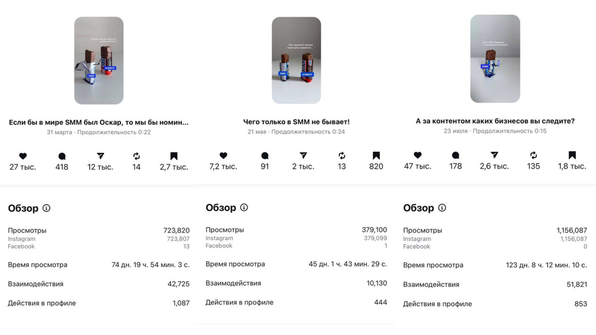 Эти ролики мы активно тестируем в Instagram*, TikTok и ВКонтакте — и на каждой из этих площадок они стабильно показывают высокие охваты и вовлечённость. В ближайших планах — выход на YouTube Shorts, чтобы охватить новую аудиторию и протестировать формат на ещё одной крупной площадке.