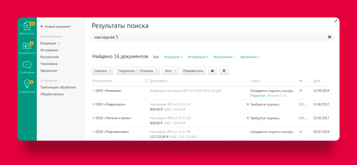В СЭД «Диадок» найди документ можно по словам, дате, типу, статусу или названию контрагента