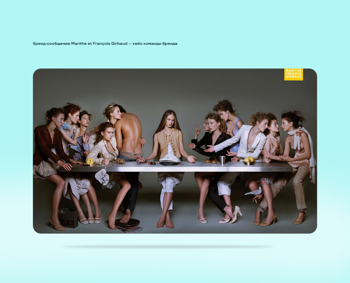 Французский модный дом Marithe et François Girbaud вызвал целый переполох своей весенней кампанией 2005 года. Они выпустили наружную рекламу, которая копировала Тайную Вечерю Да Винчи, но в образе Христа и апостолов были женщины-модели в одежде бренда.