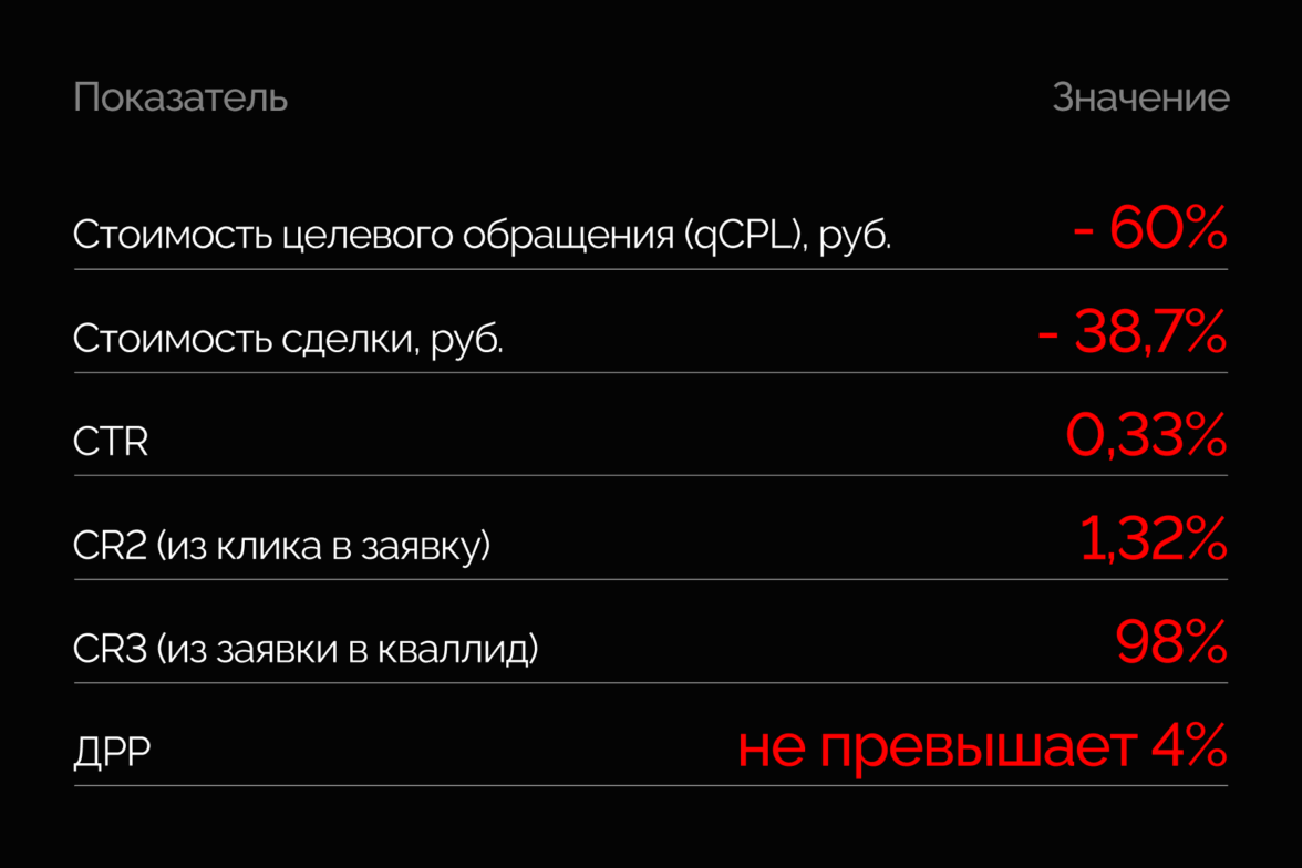 В результате мы сохранили уровень лидов при снижении бюджета на 30% и увеличили конверсию из заявки в квалифицированный лид.