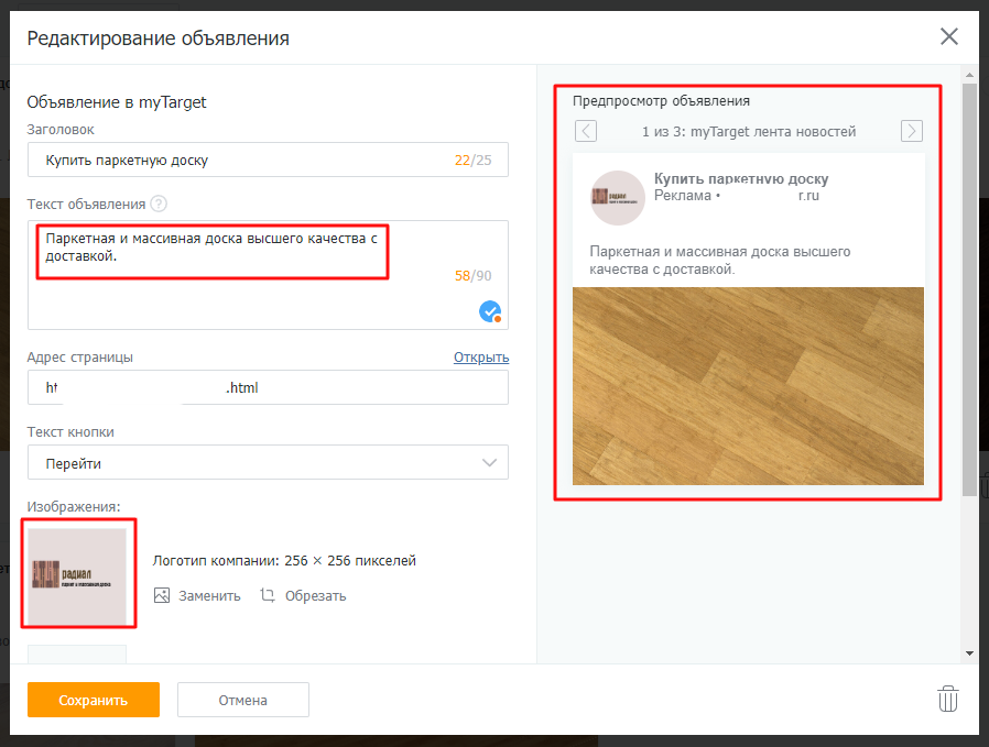 Вот так выглядит окно редактирования — мы заменили текст объявления и логотип компании, все изменения отображаются в блоке предпросмотра: