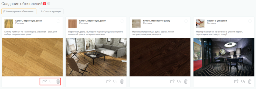 Через несколько секунд после клика на кнопку «Создать» получаем готовые объявления с креативами. Каждое можно скопировать, удалить или отредактировать: