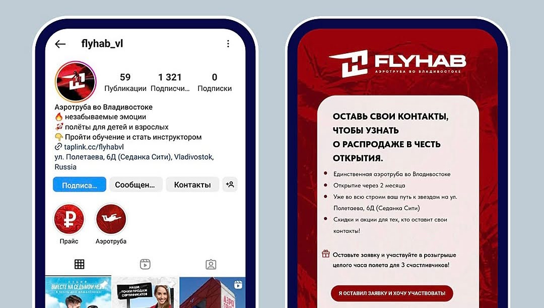 С 2022 года мы занимались продвижением Хабаровской аэротрубы в социальных сетях, и вот новую, которая открылась во Владивостоке, тоже доверили нам. Главная задача — задолго до открытия познакомить людей с проектом и собрать базу потенциальных клиентов.