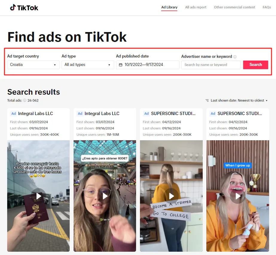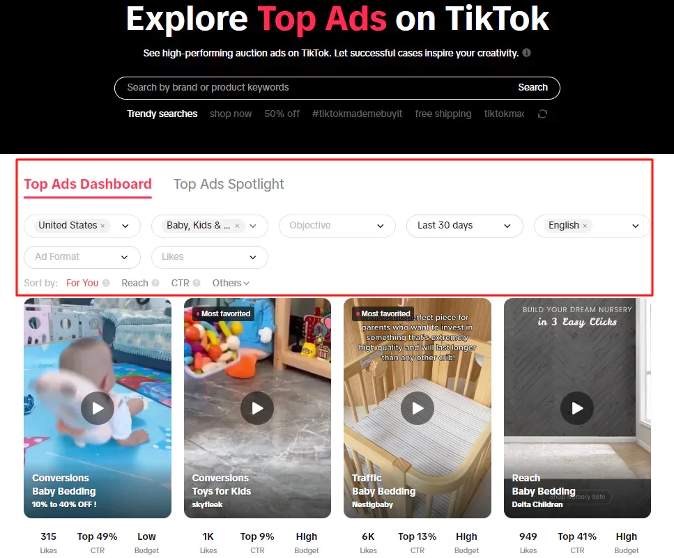 В библиотеке ТикТока удобный фильтр по странам, темам, объектам рекламы, срокам кампании, языку, форматам и лайкам. Также можно искать видео по ключевым словам