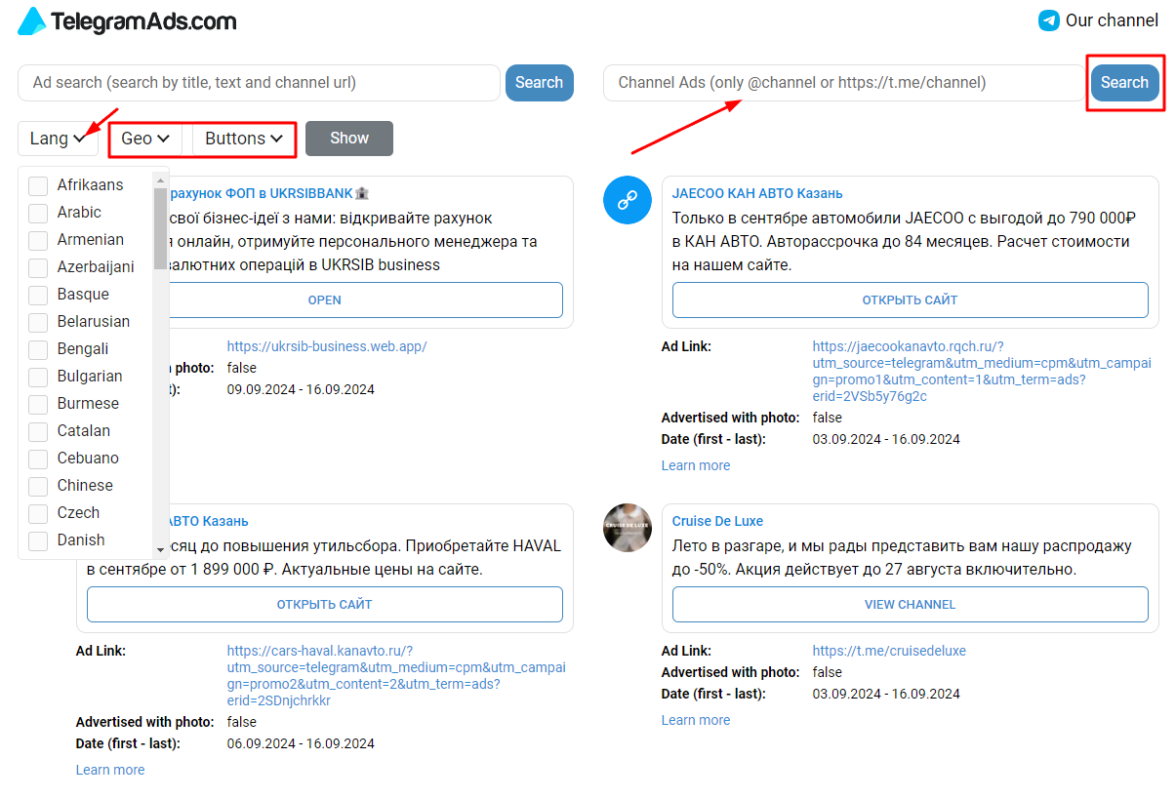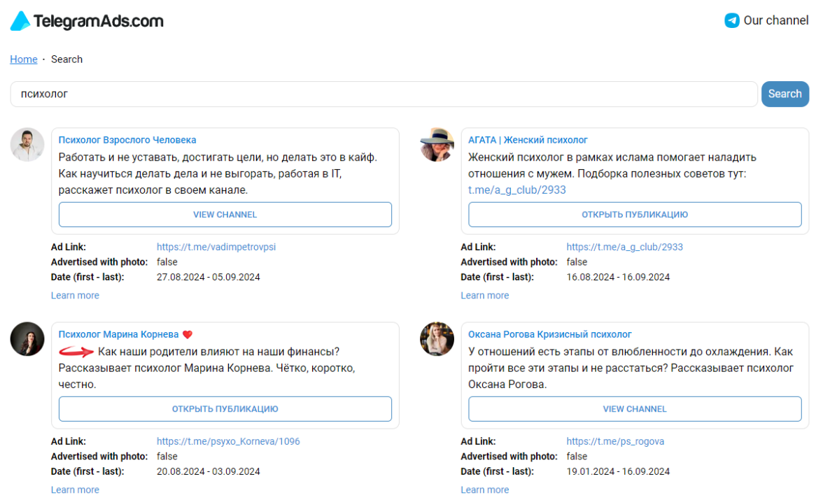 В результатах — объявление, ссылка на канал или пост, даты рекламной кампании. Клик по ссылке «Learn more» выдаст информацию о рекламодателе и список каналов, где была показана реклама.
