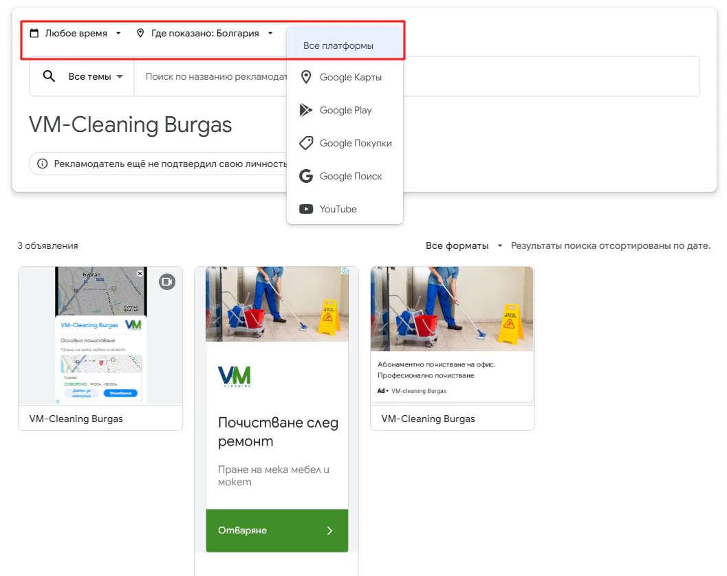 Библиотека рекламы Google. Можно найти объявления в любой стране, где присутствует Google Ads, отсортировать по времени показа и площадкам Google — Картам, Поиску, Покупкам, Google Play и YouTube. Поиск осуществляется по названию рекламодателя. Отдельно можно выбрать политическую рекламу.