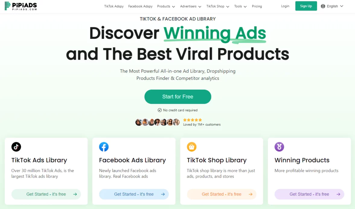 Сервис позиционируется как библиотека рекламы в Facebook* и TikTok. Также собирает рекламу из TikTok Shop. Можно использовать для сбора и аналитики креативов сразу в двух соцсетях, анализа трендов и ниши, настроек таргетинга.