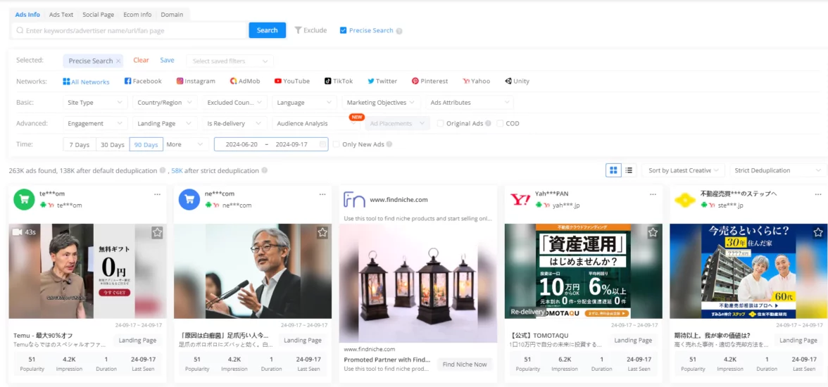 Сервис парсинга объявлений из Facebook*, TikTok, Instagram*, YouTube, Pinterest и других платформ. Кроме рекламной системы, в фильтрах поиска можно задать страну, язык, ключевые слова и множество других параметров.