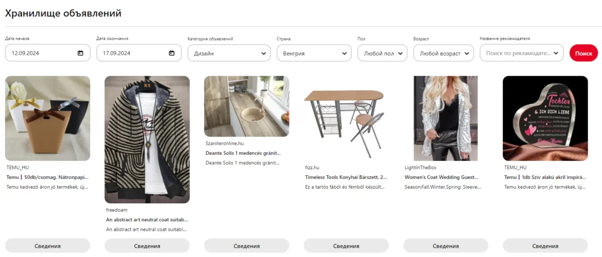 Pinterest — хранилище креативов от «картиночной» соцсети. Можно выбрать срок рекламной кампании, страну, тематику, демографические таргетинги, а также искать объявления по названию рекламодателя.