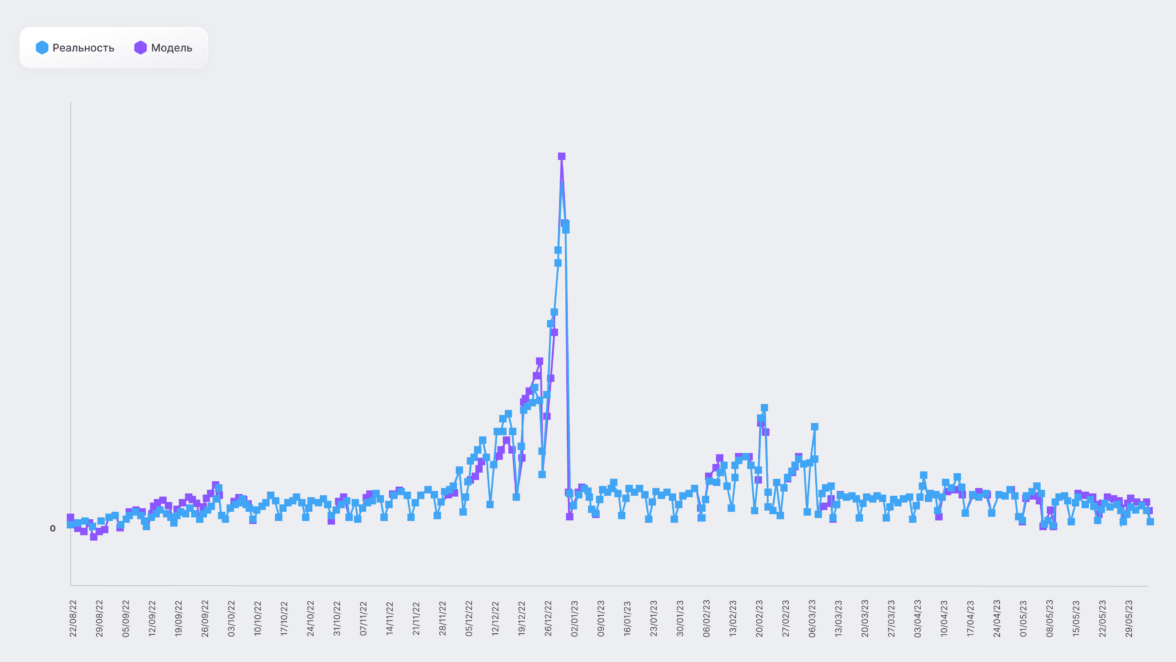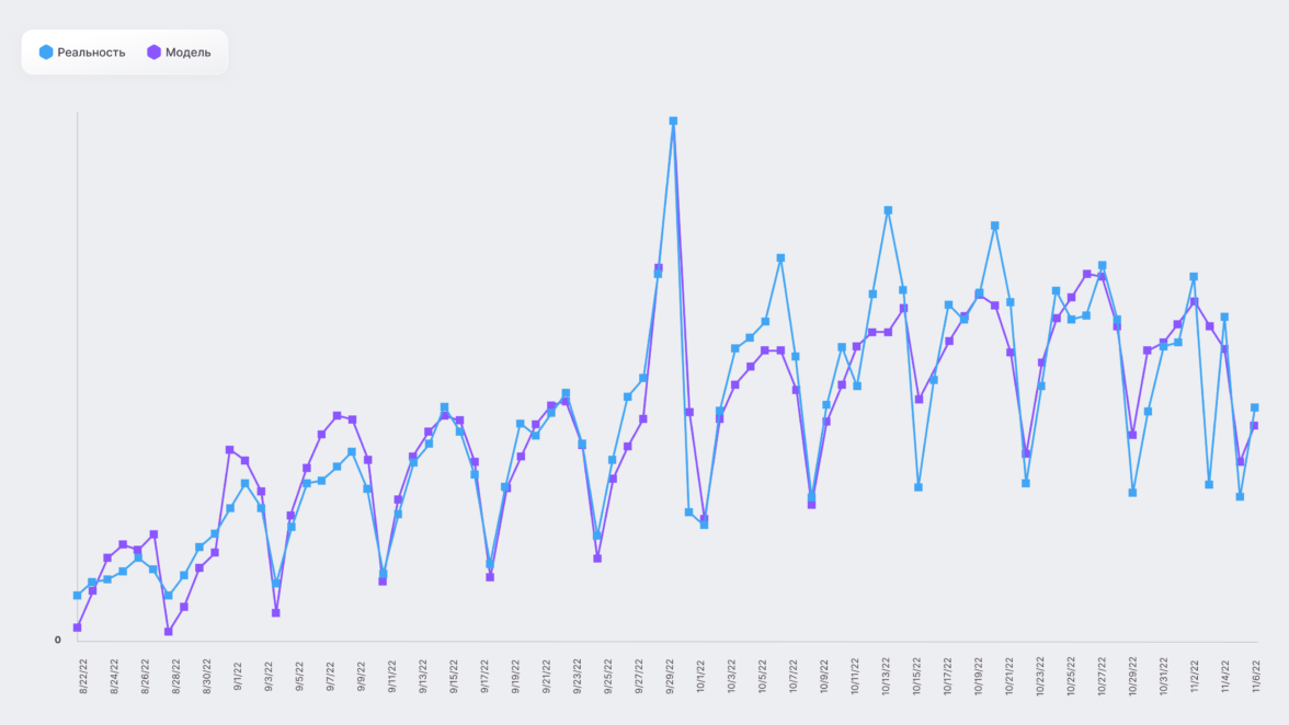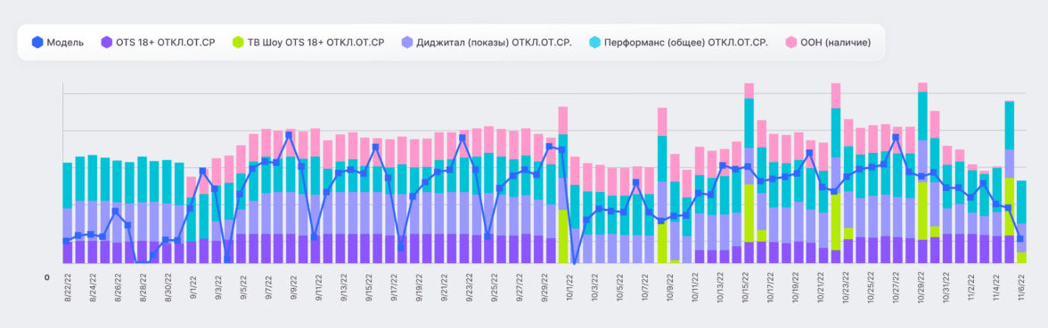 Первая модель строилась по дням, что дало необходимое количество наблюдений. За два месяца было накоплено достаточно данных для оптимизации медиамикса.