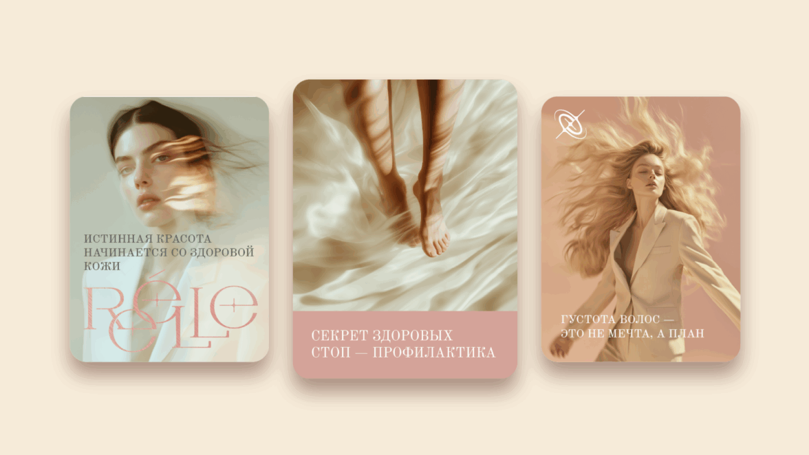 В процессе дизайн-исследования мы изучили конкурентов, проанализировали референсы и определили позицию бренда. Команде RÉÉLLE импонировал визуальный язык современных эстетических клиник с их теплым светом, душевностью и образом «своего» пространства. Именно этот баланс — профессионализм без холодности — стал ориентиром для нашей работы.