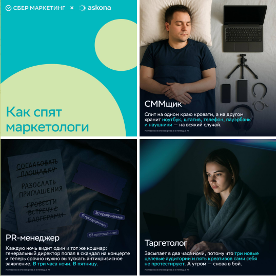 Шаблонизация как фундамент SMM. Следующим шагом стало осознание, что в SMM формально нет шаблонов в привычном представлении: каждый пост собирался дизайнером с нуля. Это обеспечивало свободу в дизайне, но разрушало системность. Поэтому мы в СберМаркетинге создали полноценную библиотеку шаблонов для ключевых рубрик: регулярные посты, карточки с исследованиями, кейсы, анонсы с премий и другие. Их больше десяти, они регулярно обновляются и экономят часы работы. За счёт этого время на создание поста сократилось с четырёх-пяти часов до полутора. При объёмах контента в нашем канале это колоссальное ускорение.
