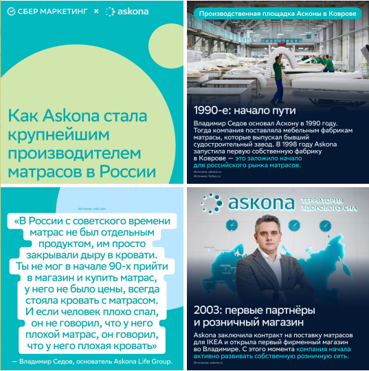 Мы постоянно боремся с похожестью. Если посты выходят часто, канал может стать однообразным. Поэтому чередуем светлую и тёмную тему, делаем спецпосты-коллаборации с другими брендами, мимикрируем под их айдентику — это сохраняет наш визуал живым. К примеру, наш свежий кейс, — бренд-день с Асконой. Целый день мы выкладывали посты в дизайне Асконы: оформляли карточки с историей бренда в фирменные цвета, генерировали AI-графику.