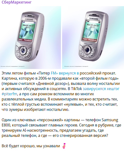 Оценивать влияние дизайна на аудиторию не всегда тривиальная задача. В СберМаркетинге мы смотрим на вовлечённость пользователей: реакции, комментарии, репосты. Именно они показывают, как визуальный приём превращается во взаимодействие. Например, рубрика «Угадай, нейронка или нет» сразу выстрелила: подписчикам нравится играть с брендом, а не просто потреблять контент.