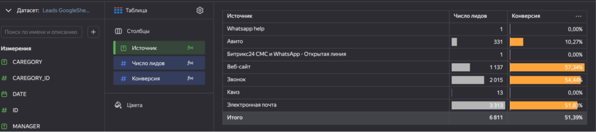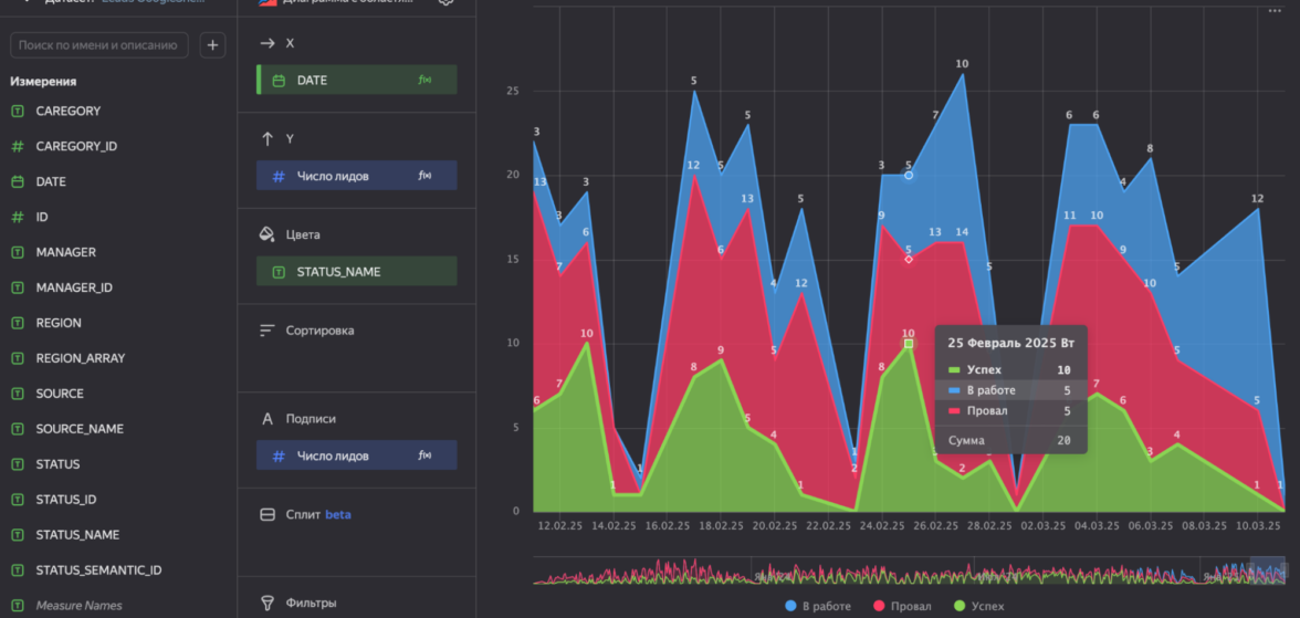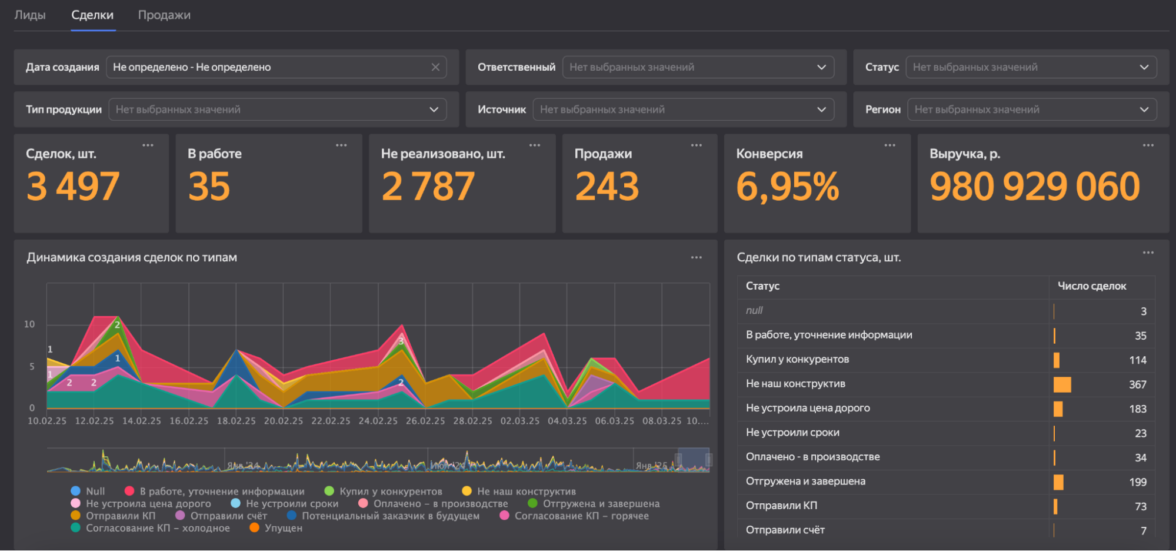 Еще один инструмент — Yandex DataLens, который позволяет анализировать информацию о продажах, клиентах, сделках и других аспектах бизнеса, используя мощные инструменты визуализации и анализа данных. В результате компания может получить более глубокое понимание бизнес-процессов, улучшить качество принятия решений и повысить эффективность работы.