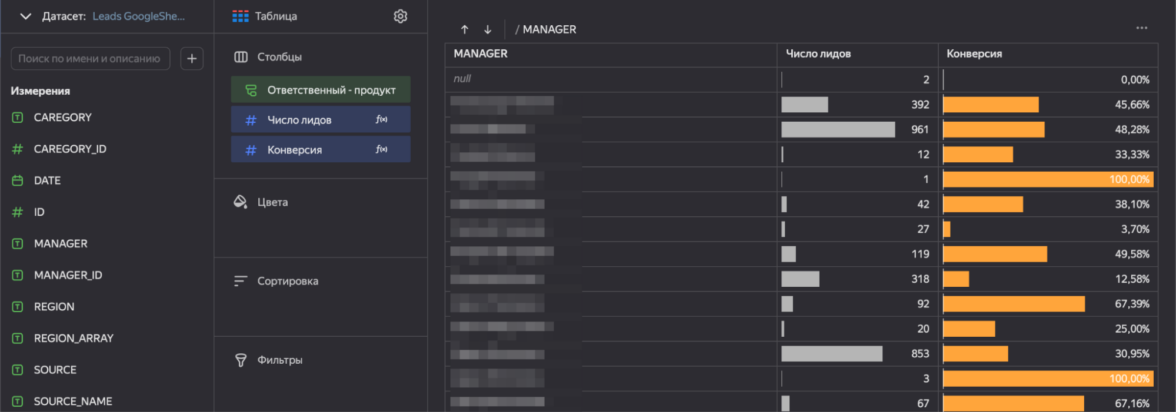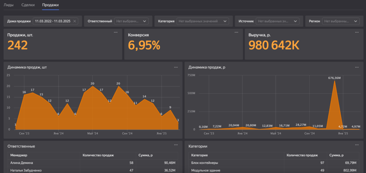 Благодаря таким отчетам появляется возможность максимально быстро проанализировать информацию в режиме онлайн или применить фильтры по категориям, менеджерам, источникам и так далее.
