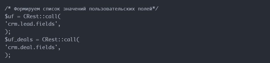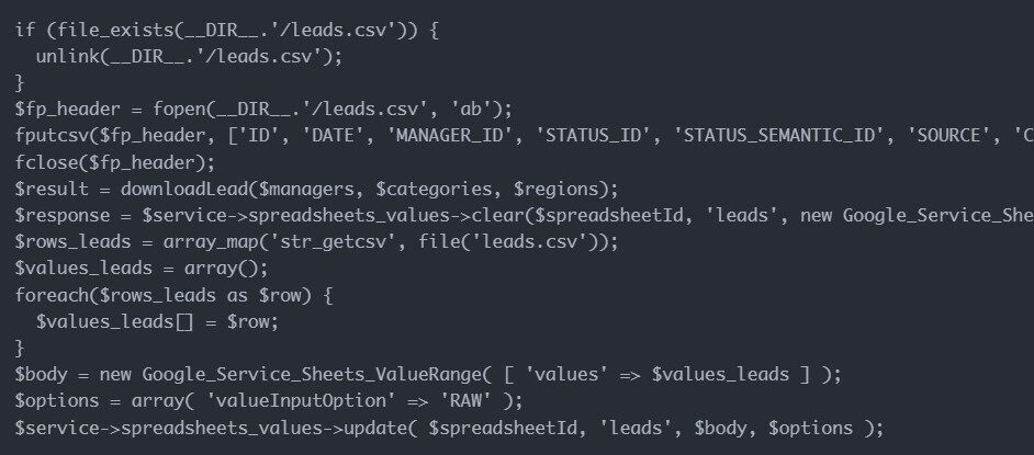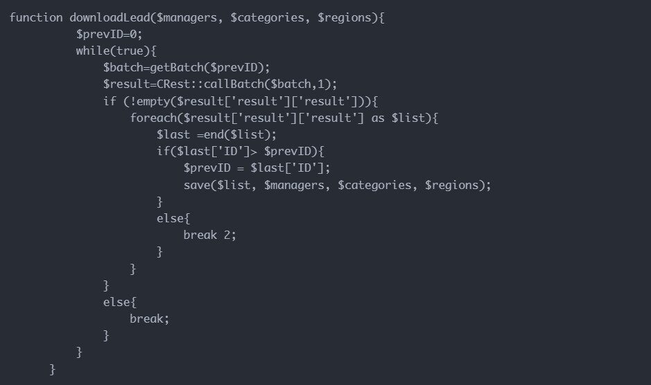 Ввиду того, что лидов и сделок много, код был оптимизирован для пакетной обработки данных (в нашем случае по 50 элементов за раз):