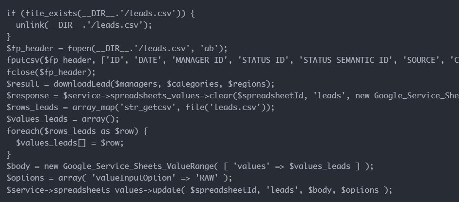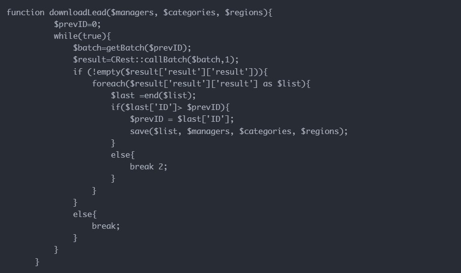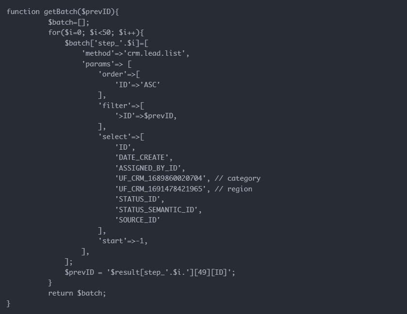 Ввиду того, что лидов и сделок много, код был оптимизирован для пакетной обработки данных (в нашем случае по 50 элементов за раз):