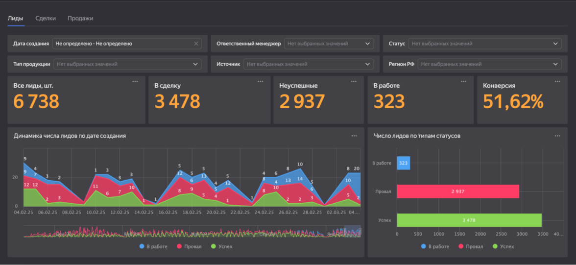 Получили данные по лидам и сделкам из Bitrix24 и обработали их в системе BI-аналитики Yandex Datalens. Пример полученного дашборда с визуализацией всей информации:
